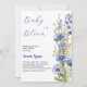 Um fundo branco chic. Decorado com flores silvestres em azul. Personalize e adicione o nome da mãe a ser e os detalhes da festa. Texto: Bebê em flor.