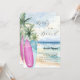 Um convite elegante para um Chá de fraldas, Uma praia arenosa de cor aquática, ondas oceânicas e palmeiras como fundo, e um prato azul e rosa na praia. Para um gênero revelador ou esperado gêmeos.
