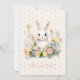 Este belo convite de chá para uma menina apresenta um coelho rodeado por flores em tons suaves de rosa sobre um fundo de bolinhas. Personalize a parte frontal e traseira com sua escolha de nome e texto especial para o próximo chá de fraldas.