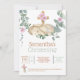 Uma ilustração adorável de mãos segurando uma menina que está deitada do lado dormindo em uma videira de eucalipto que tem bonito flores cor-de-rosa. Uma cruz de madeira aparece atrás dela com as mesmas flores cor-de-rosa e uma cruz menor no canto inferior esquerdo. Diretamente abaixo do pequeno estão modelos que podem ser personalizados. A parte traseira tem uma modelo para informações adicionais. Estes são ideais para novos anúncios de bebês nasceres; Celebrações de chá de fraldas; batismos e batizados.