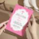 Este doce convite Baptism ou Christening apresenta uma cruz rosa e seu quadro de dentro de ornamentado de texto, definido em um fundo rosa suave. Seu texto personalizado em rosa e preto combinando com uma cruz branca esmaecida no verso termina seu convite.