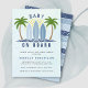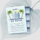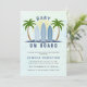 Bebê no conselho surfando, chupando o convite para o chá do bebê azul. Prepare-se para celebrar a chegada iminente de um bebê com este belo convite de chá de fraldas com um tema de surfe. A design inclui três conselhos de surfe em lindas sombras azuis, juntamente com palmeiras e raios solares colocados contra um fundo azul-claro com efeito de abertura de água azul-aqua. A parte de trás do convite apresenta faixas de na moda em vários tons de azul, unindo o tema inteiro sem problemas. Prepare-se para fazer um salto no chá de fraldas com este charmoso e único convite!