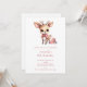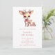 Um convite de aniversário com uma ilustração de um adorável bebê veado. Olhos grandes orelhas grandes com uma cabeça grande e pequenos chifres marrons. Usando um grande laço vermelho. De pé ao lado de uma pilha de presentes.