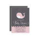 Convites para a vitrine de baleia-rosa branca Convites para chuveiros de bebês brancos e bonitos que apresentam e baleias-bebês cor-de-rosa - vitelo e roteiro de caligrafia branca.