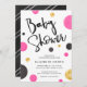 Bolinhas Rosa e Dourado Bebê convites com "Chá de fraldas" em um roteiro amigável manuscrito e grandes bolinhas cor-de-rosa e coloridas flutuando em um design chic e moda. Convites perfeitos para chás de fraldas modernos e divertidos.