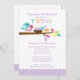 Comece o seu evento com nossos passarinhos bonitinhos ninho gêmeos Bebê Chá convidando a mãe mais doce e pais de pássaros sentados em um galho de árvore com filhotes roxos gêmeos em um ninho. Nosso convite para o chá de fraldas de gêmeos, moderno e coloridos, é feito em um fundo branco com uma fronteira e apoio roxas bolinhas. Perfeito para um chá de fraldas gêmeo de meninas. Apenas personalize com suas informações e você está pronto para ir! Itens correspondentes, incluindo postagem de chá de fraldas gêmeos, adesivos favoritos, cartões de agradecimento e obrigado que você adesivos também está disponível em nosso compro. Também disponível em azul para um chá de fraldas gêmeo. © Dreamlike Magic