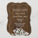 O convite de janto de ensaio de casamento em gibi feito em um olhar de madeira escura com gráficos de flores do hálito de bebê branco, no fundo. Personalize todo o texto para atender às suas necessidades.