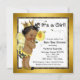 As meninas são convidadas para chá de fraldas com uma linda garotinha afro-americana vestindo um adorável vestido de abelha em um bonito fundo preto e ouro com abelhinhas voadoras. Você pode personalizar facilmente este adorável convite para chás de fraldas de abelhas para o seu evento simplesmente adicionando seus detalhes no estilo de fonte de sua escolha.