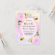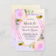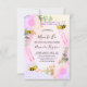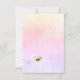Um chá de fraldas de verão divertido para celebrar uma menina. Fundo colorido do arco-íris, cor-de-rosa, roxo e ouro, com um padrão de pente de mel. Um quadro geométrico. Decorado com flores e eucalipto verde e abelhas felizes. Com o texto: Mãe a Bee e o nome da mãe a ser escrita na frente com um estilo escrito à mão moderno. Letras negras. Volta: padrão de mel e uma abelha feliz sorrindo.