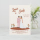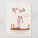 Antiguamente convite de casamento elegante sobre o fundo bege, com noiva graciosa e noiva cercado por flores laranja vibrantes, evocando calor e romance.