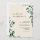 Convites de casamento em estilo simples com um design moderno fora do centro e um quadro botânico. Eucalipto azul-esverdeado escuro sobre fundo de marfim. Design casual ideal para casamentos pequenos, ou qualquer casamento com um tema minimalista.