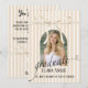 Celebrate your graduate in style with this elegant beige stripe graduation invitation featuring a soft coquette bow detail and a refined editorial layout. The vertical striped background in warm cream and neutral beige tones creates a timeless and modern aesthetic, perfect for a feminine and sophisticated graduation party.