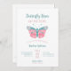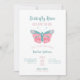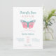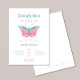 Borboleta Beija e Bebê Deseja que o convite para o chá de fraldas da menina apresente uma borboleta branca com tipografia rosa e lacrimogênea. O texto "é uma menina" aparece no verso.