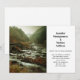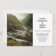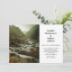 Convite de casamento com uma bela fotografia da natureza. Paisagem sombria e linda. Uma ponte de pedra isolada ao lado de um rio raso com cachoeiras, floresta e montanhas ao redor da área.