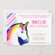 Convite de Aniversário para Garota Mágica do Unicórnio Bonita. Este belo e mágico cartão de aniversário é perfeito para uma garota especial no seu aniversário. O cartão apresenta um desenho de unicórnio fofo, estrelas coloridas e informações de aniversário.