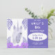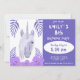 Convite De Aniversário Da Rapariga Tropical Do Unicórnio Roxo. Desenho de uma linda cabeça de unicórnio, uma flor de hibisco e folhas tropicais em cor roxa. A parte de trás tem um padrão de bolinhas branca em roxo. Personalize todo o texto na frente da placa.