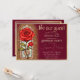 Este convite de festas personalizado apresenta uma Beleza mágica e encantadora e o tema conto de fadas da Besta. O fundo é um antigo design de papel-pergaminho vermelho, borrado com uma moldura de ouro. Coloca-se à esquerda uma imagem de uma rosa vermelha de vidro colorido, acentuada com um padrão de brilho dourado. O anúncio Seja nosso convidado é impresso no topo em uma fonte de estilo medieval.