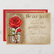 Este convite de festas personalizado apresenta uma Beleza mágica e encantadora e o tema conto de fadas da Besta. O fundo é um design de papel pergaminho, de aparência antiga, bordado com uma moldura de ouro. Coloca-se à esquerda uma imagem de uma rosa vermelha de vidro colorido, acentuada com um padrão de brilho dourado. O anúncio Seja nosso convidado é impresso no topo em uma fonte de estilo medieval.