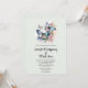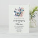 Convite de casamento com um trio de borboletas a esvoaçar entre algumas flores bonitas. Paleta de cores azul, rosa e verde.