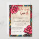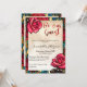Este convite de festas personalizado apresenta um tema Beleza e conto de fadas da Besta. A borda apresenta um padrão de vidro manchado romântico, com uma rosa de vidro manchado colocada no canto superior esquerdo e inferior direito. O fundo é um padrão de gradiente dourado esmaecido. A frase clássica Beleza e Besta, "Seja nosso Convidado" aparece no topo em uma letra vermelha escura, ao lado de uma das rosas vermelhas.