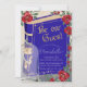 Este convite de festas personalizado apresenta uma Beleza glamourosa e o tema conto de fadas da Besta. O fundo tem um design de papel pergaminho desbotado com um gradiente azul na parte inferior. O quadro é acentuado com rosas vermelhas e vinhas. Um cobrir azul de conto de fadas é impresso no centro com a frase "Seja nosso convidado" impressa em um design dourado. Um rosa de ouro mágico em um vaso é fotografado na parte inferior esquerda.