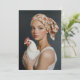 Uma jovem com olhos azuis e traços delicados brilham suavemente enquanto segura uma galinha branca. Ela veste um véu floral amarrado em sua cabeça, evocando uma estética rústica e vintage. O fundo escuro contrasta com a sua pele justa e com as penas brancas do frango, criando um retrato clássico eterno com efeito pareado.