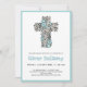 Convite floral de batismo com uma cruz cheia de flores azuis e pálidas, verde e bagas. Convite de batismo azul com flores bonito e o nome do seu filho numa charmosa fonte turquesa. Um convite batismo com uma cruz floral azul.
