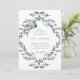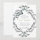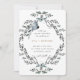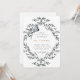 O belo convite para o casamento apresenta caligrafia elegante, e uma faixa de cor botânica de cinza azul rústica com folhagem e flores.
