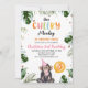 Bonito Chapéu Rosa, Nosso Convite de Aniversário de Macaco Cheeky Qualquer idade nosso convite de aniversário de macacos apresentando um macaco fofo, chapéu de festa rosa, balão laranja e folhagem tropical. Este convite de aniversário de macacos-prego também apresenta uma palavra multicolorida.