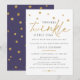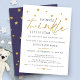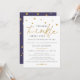 Convite de chuveiro de bebê adorável e fofo com estrelas espalhadas ao longo da parte superior e a palavra "brilhe" em dourado com tipografia serifada moderna. O verso do convite é roxo ameixa com estrelas douradas espalhadas. Itens correspondentes nesta coleção.