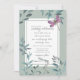 Este belo convite para o casamento apresenta duas libélulas aquáticas, uma em tons de azul e verde com asas iridescentes e a outra com asas em tons de roxo e rosa. Eles estão assentando em um arranjo simples de vegetação natural de jardins de aquarela em tons de verde, azul, cinza e marrom. -