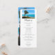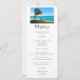 Cardápio de evento com uma fotografia cênica. Um oceano azul claro com uma praia de areia branca.