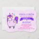 Convite de aniversário com um desenho caprichoso com um unicórnio cor-de-rosa que tem um homem roxo e um conto. Esta criatura fofa está vestindo óculos de sol em forma de coração e tem pequenas estrelas e um coração em seu corpo.