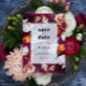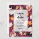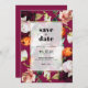 Um belo convite de casamento com um personalizável Save The Date design apresenta rosas frescos, ranúculus, dahlias, snapdragons e begonias em cores vermelho, laranja, branco e rosa, exibidas contra um fundo vermelho magenta. A linguagem das flores, conhecida como floriografia, atribui significados diferentes a vários tipos e cores das flores. Por exemplo, rosas representam amor; begônias simbolizam harmonia; dahlias significam compromisso; ranúnculo representa charme; e snapdragons significam graça.