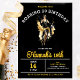 O Convite de aniversário Chic Roaring 20 apresenta uma garota flapper dançando no centro. O esquema arrojado, arrojado, negro, dourado e branco é seguro para gerar entusiasmo quando seus convidados receberem seu convite.