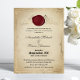 Este convite romântico de casamento apresenta um tema elegante de conto medieval. O fundo é um design de papel pergaminho desbotado que se parece com um pergaminho medieval. Um quadro de ouro ornamentado borda a informação do casamento. Coloca-se no topo um selo de cera vermelha com as iniciais do casal.