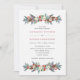 Este belo convite para o casamento de férias apresenta galhos verdes de pinheiro com aquarela, com pinhos cones, groselhas vermelhas, flores coloridas com creme e folhagem de Natal verde.