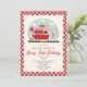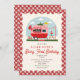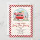 Morango, o primeiro aniversário do morango, com ilustração da camisa de mercado do agricultor, decorada com um bunting de gingham e balões vermelhos com mesa de piquenique e bolo de aniversário de morango. Borda e verso são gingham vermelho.