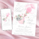 Convites de chá de bebê de elefante menina com doce elefante bebê menina, balões cor-de-rosa e borboletas em um lindo fundo de nuvem de pontos rosa. Este convite de chá de bebê de elefante rosa é facilmente personalizado com os detalhes do seu evento. Você pode adicionar uma cor de fundo à frente deste adorável convite de chá de bebê de elefante menina.