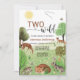 Segundo aniversário "Dois selvagens", design de festa da floresta moderna e colorida, neutra do ponto de vista do gênero, numa letra elegante, com raposa bebê, coelho, ouriço e outros animais e aves florestais num campo com árvores.