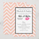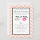 Um convite de casamento moderno com lábios rosa fazendo um beijo e uma ilustração de bigode retrô. Tudo sobre um fundo de chevron em pêssego. Personalize com todos os detalhes do seu casamento.