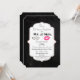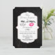 Um convite de aniversário de casamento com uma design de tendências - lábios de kissy cor-de-rosa glamourosos e uma ilustração de bigode retrô-olado masculino. Com as palavras Sr. e Sra. Set sobre um fundo negro de quadro negro. Um quadro decorativo de rico com uma borda de gradiente dourado colocada sobre cima com o dentro de informações de sua parte. Personalize com os detalhes da sua festa de aniversário.