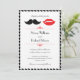 Os lábios vermelhos lúcidos e o bigode debonair são as principais estrelas deste moderno e elegante conjunto de convites para o casamento. O padrão de som no fundo adiciona encanto retrô sem esforço.