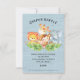 Animais da selva de safari bonito com zebra, hipopótamo, elefante, leão, macaco e girafa com uma variedade de folhas da selva colocadas sobre um fundo azul de burlap. Visite nosso compro para ver toda nossa coleção de chás de fraldas de safari da selva para meninas e chás neutros em gênero.