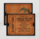 Convites de Tíquete, apresenta fundo curado cor de laranja escuro com imagem gráfica web de aranha, num estilo de tíquete falso. personalize com as informações da sua parte. Faz um excelente, um convite exclusivo para hallowen ou qualquer ocasião! Estimulado para se parecer com um verdadeiro bilhete de entrada com cortes falsos e lados perfurados falsos, este convite ousado e divertido é excelente para uma festa em qualquer idade! A parte de trás contém design laranja envelhecido com teia de aranha e morcegos pretos.