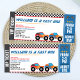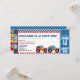 Rápido convite para primeiro aniversario de passagem de caminhonete monstro desenhado como um bilhete de admissão VIP com caminhões monstros coloridos e sinalizador de controlo.