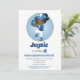 O convite de aniversário desta garota mostra uma linda moça africana de softball americana em uniforme azul com mitt, pronta para jogar a bola.