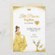 Birthday invitation featuring a princess in a yellow gown and a candelabra character. Text reads, "Little Princess Sophia is turning five," with elegant gold accents.