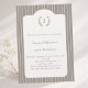 The subtle vertical taupe stripes frame a beautifully shaped ivory panel, creating a balanced and upscale look. At the top, a delicate laurel wreath surrounds a personalized monogram, adding a bespoke touch that makes this invitation feel truly custom. The combination of modern minimalism and traditional elegance makes it perfect for milestone birthdays such as a 40th, 50th, 60th, or beyond.