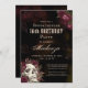 Celebrar qualquer aniversário com um tema de crânio e rosas com este convite de festas com um crânio de aquarela adornado com rosas de marrom burgundy, vintage e tipografia elegante com roteiro de caligrafia contra fundo texturizado de grunge escuro. ASSISTÊNCIA: Para obter ajuda com a modificação ou personalização do design, alteração de cor, redimensionamento, transferência do design para outro produto ou, se você quiser coordenar itens, entre em contato com o designer ANTES DE PEDIR através da guia MENSAGEM de bate-papo Zazzle abaixo ou envie um email para makeitaboutyoustore@gmail.com.